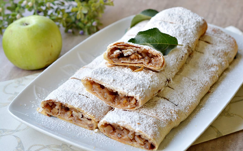 For dessert, enjoy the delicious Strudel cu mere, a puff pastry filled with spiced apples, showing the Austrian influence on local baking.