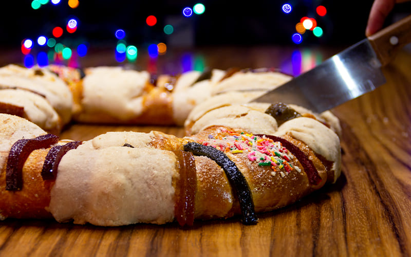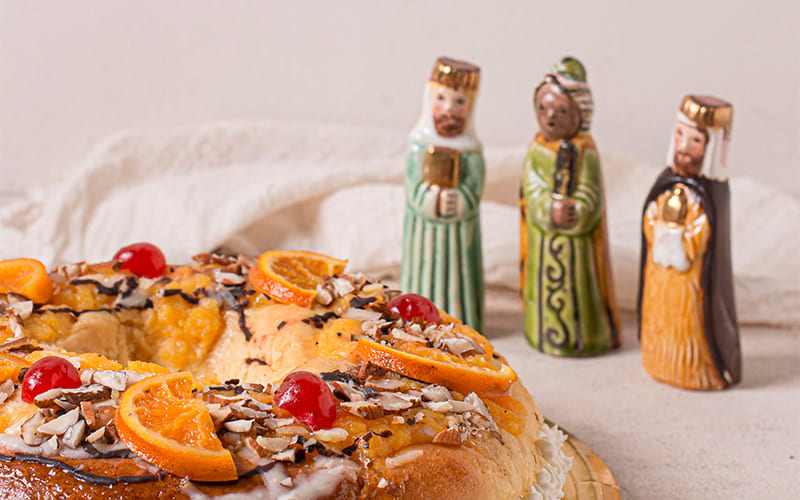 The most emblematic dish is the Rosca or Roscón de Reyes, a circular sweet bread decorated with candied fruits that represent the jewels of the Wise Men. A small figurine or bean is usually hidden inside, determining who will have good luck or who must prepare the bread the following year.