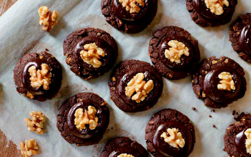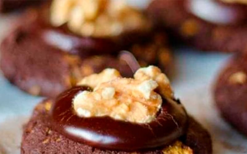 • Once cooled, top each biscuit with chocolate icing and decorate with half a walnut or chopped walnuts.